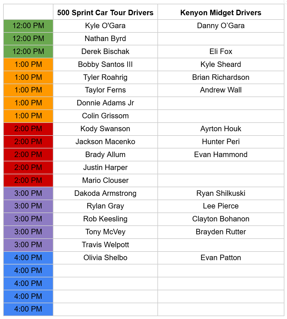 Here is the information for the yourBigplans.com 500 Sprint Car Tour Media Day. Kenyon Midget Series drivers will also be participating. This is a chance for us to collect professional images and video content to be used throughout the season.